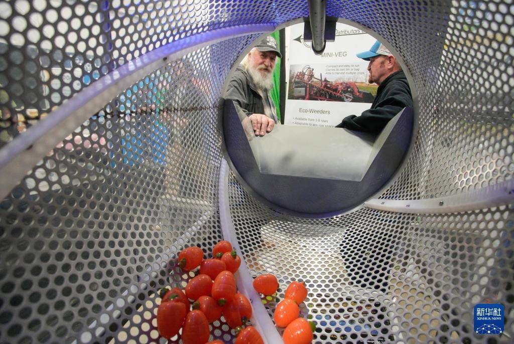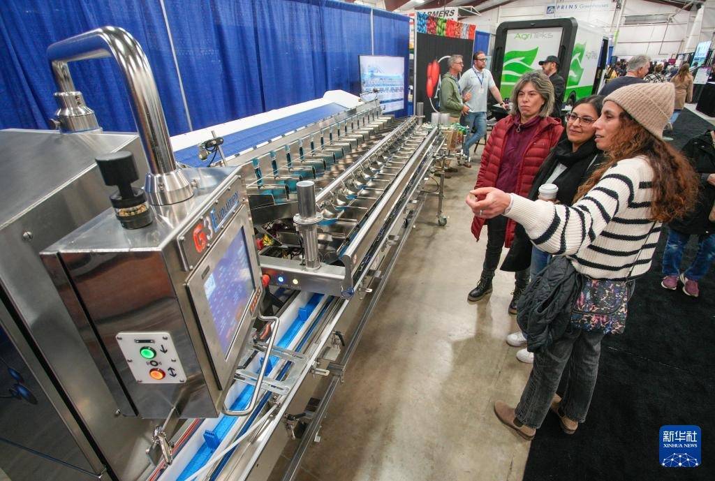 1月22日,东说念主们在加拿大阿伯茨福德举办的2026年太平洋农业展上参不雅生果清洗机。