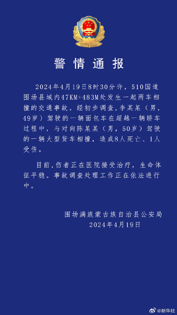 经初步拜访,李某某(男,49岁)驾驶的一辆面包车在特殊一辆轿车经过中,与对向陈某某(男买球下单平台,50岁)驾驶的一辆大型货车相撞,形成8东说念主亏蚀、1东说念主受伤。现在,伤者正在病院经受调治,生命体征平稳。事故拜访处置责任正在照章进行中。