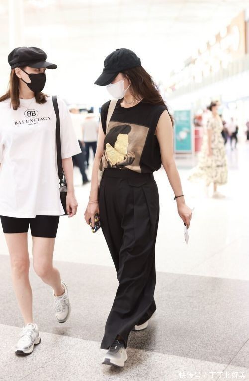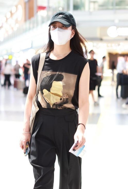 玄色的无袖T恤配上玄色的阔腿裤,这种穿搭颠倒的先锋和利落,伶仃黑的造型呈现出了很酷的气质,而T恤上头融入了印花的图案点缀也不会认为单调哦,反而更酷飒。