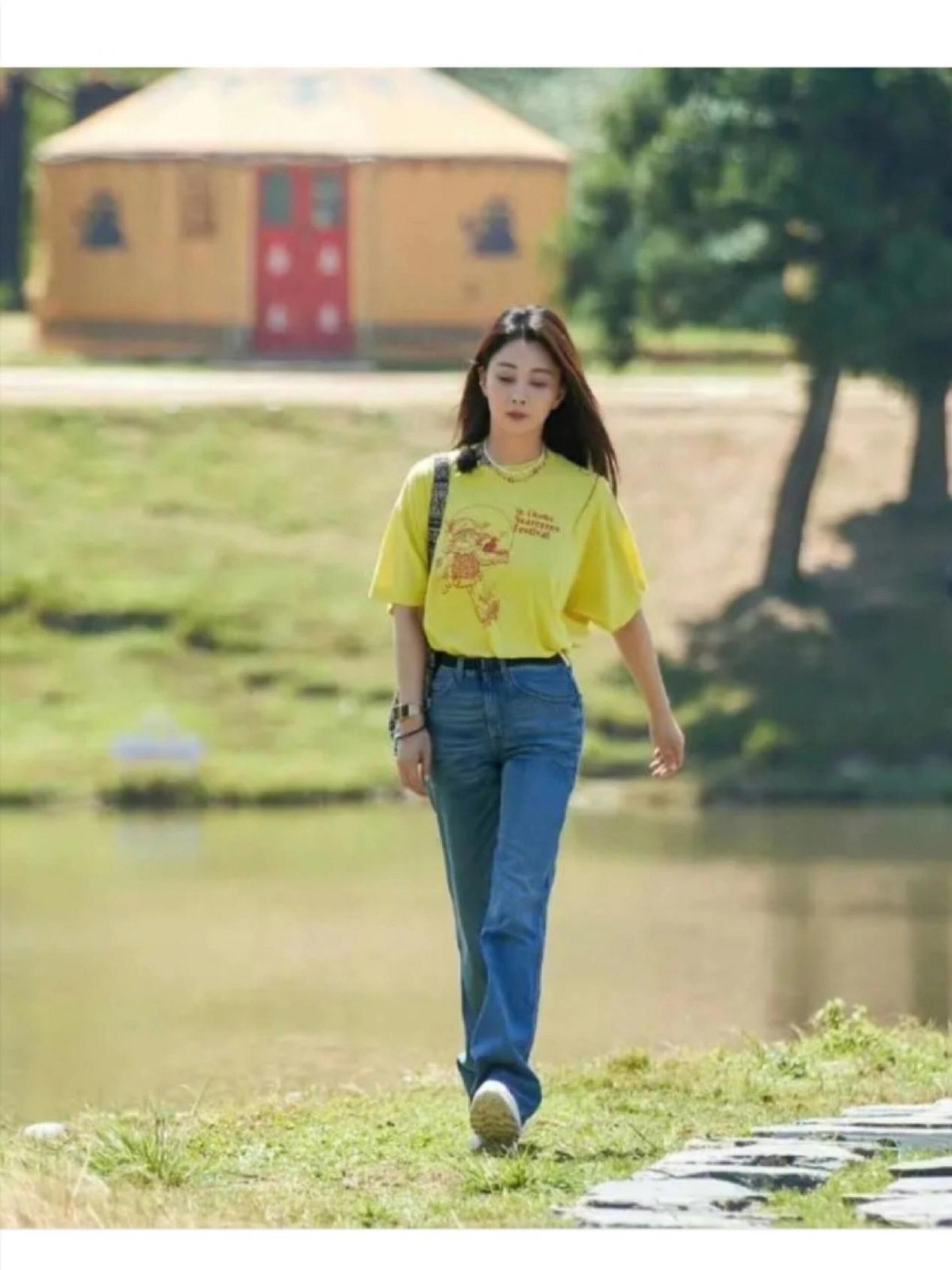 T恤的最好搭档等于牛仔裤,尤其是像这种黄色T恤配上牛仔裤之后,更是不错很好地营造出闲隙感。