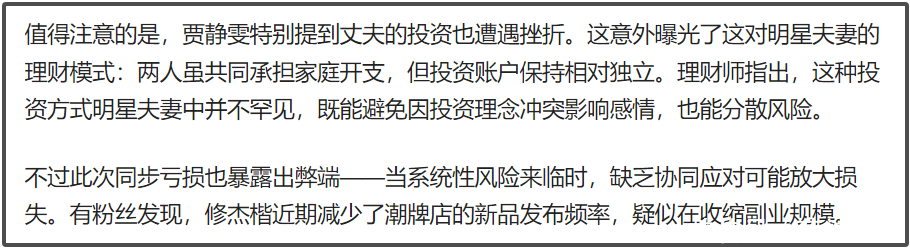 本来前段期间贾静雯对外聊起股市亏空,就被网友发现她和修杰楷财务分开,相互不了解两边具体投资情况,激励了关连他们婚内财产的相关,虽阐发星佳耦各自投资并不疏远,不错一定进度上减少风险,但过往一多数明星佳耦婚变,有个光显迹象即是刊出谐和公司呢。