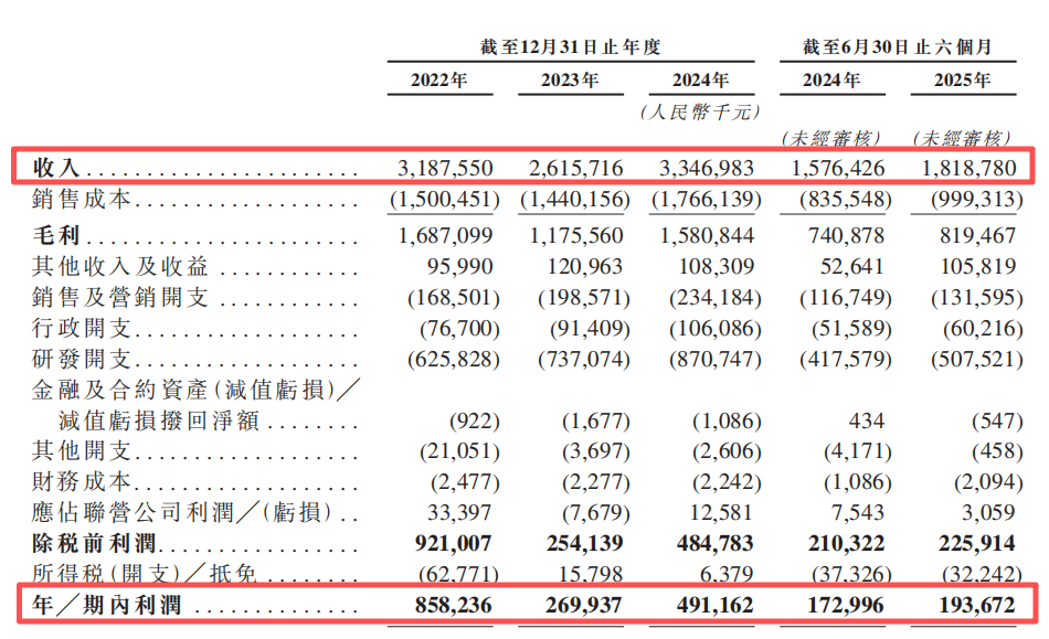 招股书显露,2022年、2023年、2024年及2025上半年,圣邦股份永别兑现营收31.88亿元、26.16亿元、33.47亿元及18.19亿元;同期,公司净利润永别为8.58亿元、2.7亿元、4.91亿元及1.94亿元。