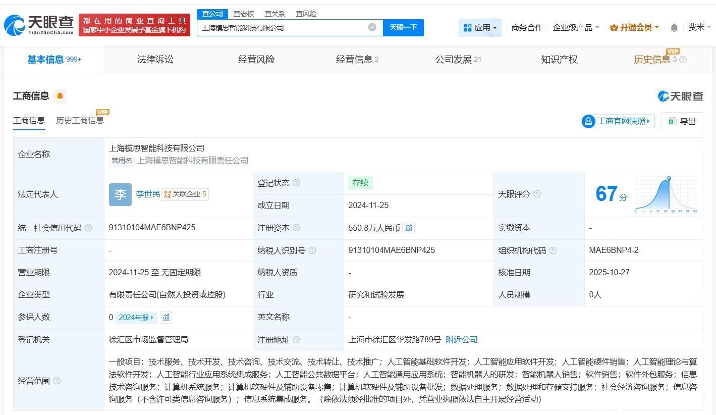 该公司竖立于2024年11月,法定代表东说念主为李世民,打算领域包括东说念主工智能基础软件开垦、东说念主工智能哄骗软件开垦、东说念主工智能硬件销售等,现由邱锡鹏、李世民及上述新增推动等共同捏股。