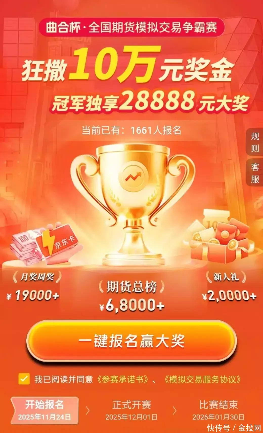 好音讯!曲合APP豪掷10万元奖金,重磅推出曲合杯·寰球期货模拟来回争霸赛,现已开启报名啦!大赛设有总榜奖、月榜奖、周榜奖、每周正收益奖、新东谈主奖等多重奖项,东谈主东谈主齐有契机免费拿奖;并且奖金颇丰,总冠军独享28888元现款,新东谈主礼超2万元,速即跟小编来望望吧~