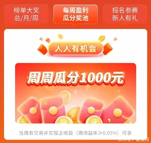 大赛时分,每个跳动3个往畴昔的当然周会确立一个1000元现款红包池,惟有参赛者当周模拟大赛账户有来回(开仓或平仓)并罢了正收益(周收益率≥0.05%)就能参与中分。