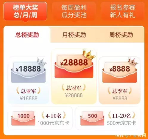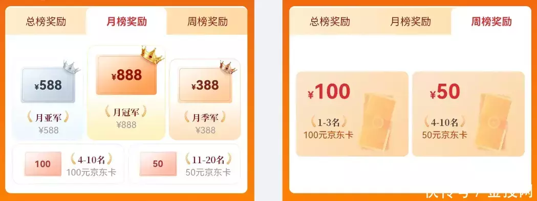 此外,每月还有20东谈主可取得月榜奖励,赛期两月共计有40东谈主获奖,最高888元现款。周奖每周有10东谈主可得,赛期共8周,共计有80东谈主可获奖,最高为100元京东卡。