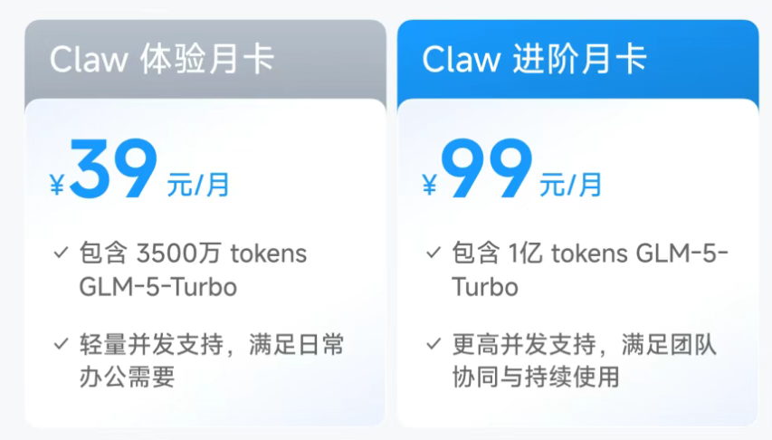 为了让企业和个东说念主完了龙虾“tokens解放”,智谱即日起推出基于GLM-5-Turbo的龙虾套餐,包含个东说念主版和Team版,其体验月卡39元就能得回3500万Tokens,进阶月卡99元得回1亿Tokens, 非论你是一东说念主公司、创业团队,简略是大中型企业,齐能把柄本人业务界限活泼订阅套餐。
