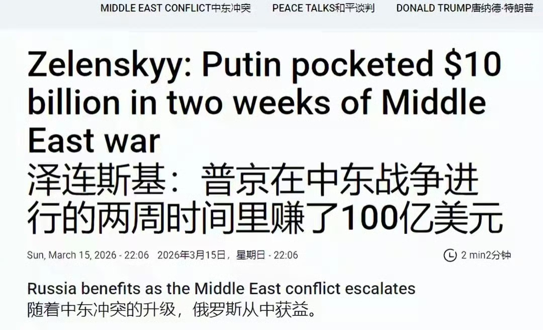 泽连斯基连声诉苦,普京在两周内就赚了100亿好意思元。