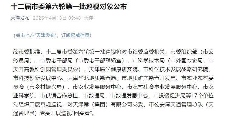 东说念主民网天津4月13日电 据天津发布公众号4月13日音信,经天津市委批准,十二届市委第六轮第一批查看将对市纪委监委机关、市委组织部(市公事员局)、市委老干部局(市委老干部取悦室)、市科学技巧局(市番邦大众局、市天开高教科创园惩处委员会)、天津医学健康盘考院、市科学技巧发展战术盘考院、市科技立异发展中心、天津华北地质勘查局、市地质矿产勘查建立局、市农业农村委员会(市乡村振兴局)、市农业发展干事中心、市农村社会功绩发展干事中心、市农业科学院、市供销相助总社、市数据局、市数据发展中心、市投资促进局等17个单元党组织开展惯例查看足球投注app,对天津港(集团)有限公司党委、市公安局交通惩处总队(交通惩处局)党委开展查看“回头看”。